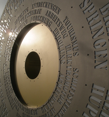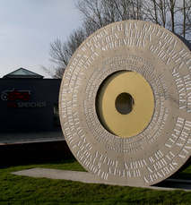 Die skulpturale Umsetzung dieses komplexen Phänomens konnte nur in einer stark abstrahierten Form geschehen, in der sich möglichst viele Aspekte spiegeln. Wir griffen auf das Bild der runden Scheibe zurück, die gleichzeitig Rad und Münze sein kann. Beide rollen und mit dem Bild der Münze ergab sich die Chance, „beide Seiten“ der Mobilität darstellen zu können: die positiven wie auch die negativen. Am Findungsprozess hierfür waren Einbecker Schülerinnen und Schüler beteiligt, mit denen wir Mobilitätsverben und deren Folgen zusammentrugen und diese dann den beiden „Seiten der Medaille“ zuordneten. Den drei Außenkreisen ordneten wir die Verben zu, die das „Profil“ der Radscheibe bilden und in den Innenkreisen befinden sich die Folgen.