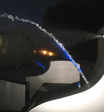 Aus Ihnen treten vorn Wasserstrahlen bogenförmig aus, die bei eintretender Dunkelheit über ein Glasfaserlichtleichtsystem angestrahlt werden. Eine Schlitzrinne nimmt das Wasser auf der unteren Ebene auf. Von dort gelangt es in den Filterschacht und anschließend in die Zisterne.